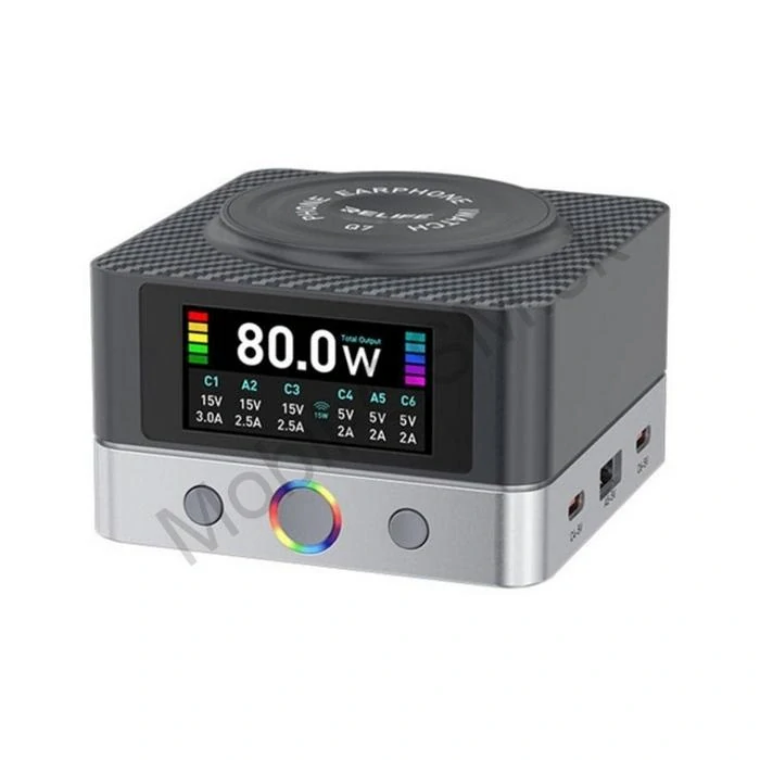 Parametre: Značka: Relife | Model: RL-Q7 | Celkový výkon: 65W (Max) | Funkcie: PD3.0, QC3.0, PPS, Wireless Charge | Displej: LCD.